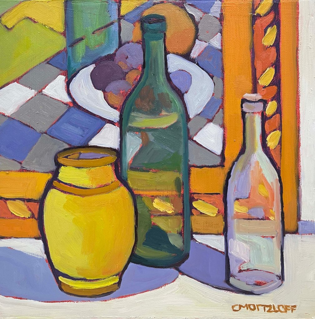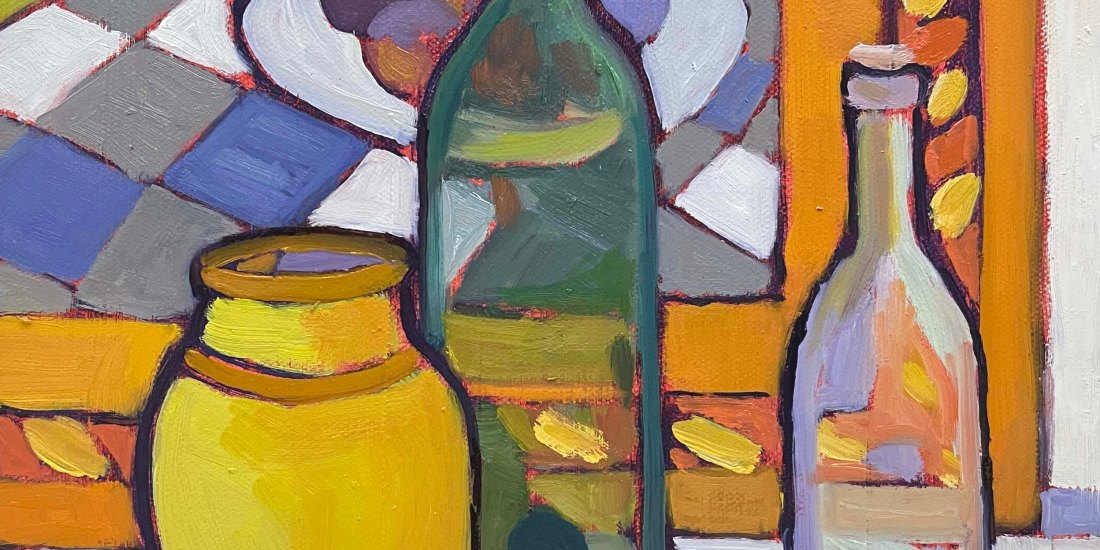 In this still life, past and present meet in quiet dialogue. Three vessels stand before a patterned backdrop: a golden yellow jar and two luminous glass bottles. This backdrop suggests windows, frames, and echoes of other paintings. This interplay deepens with the reflection of the green glass bottle. These overlapping spaces feel like a layering of time, where one moment both influences and shapes the next.