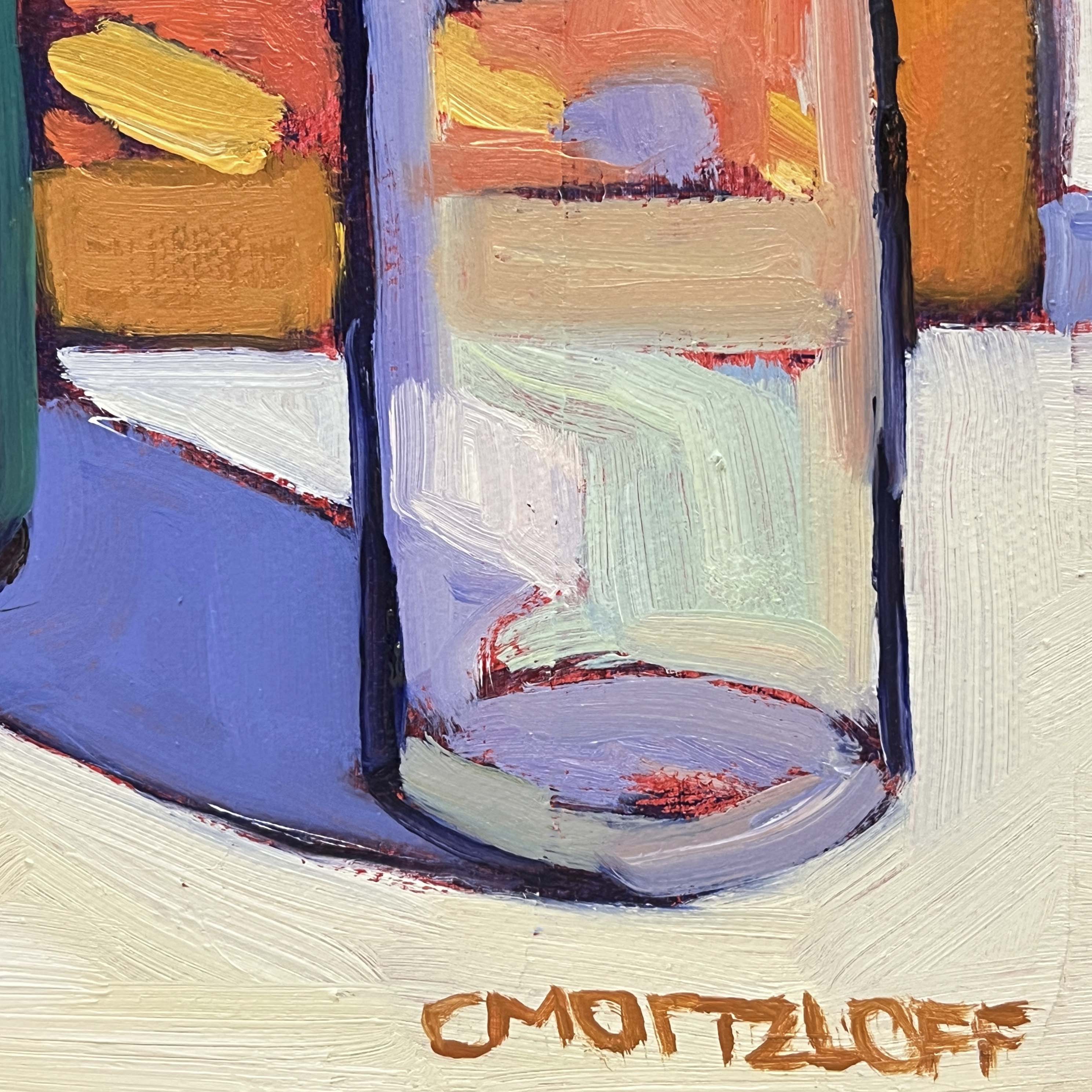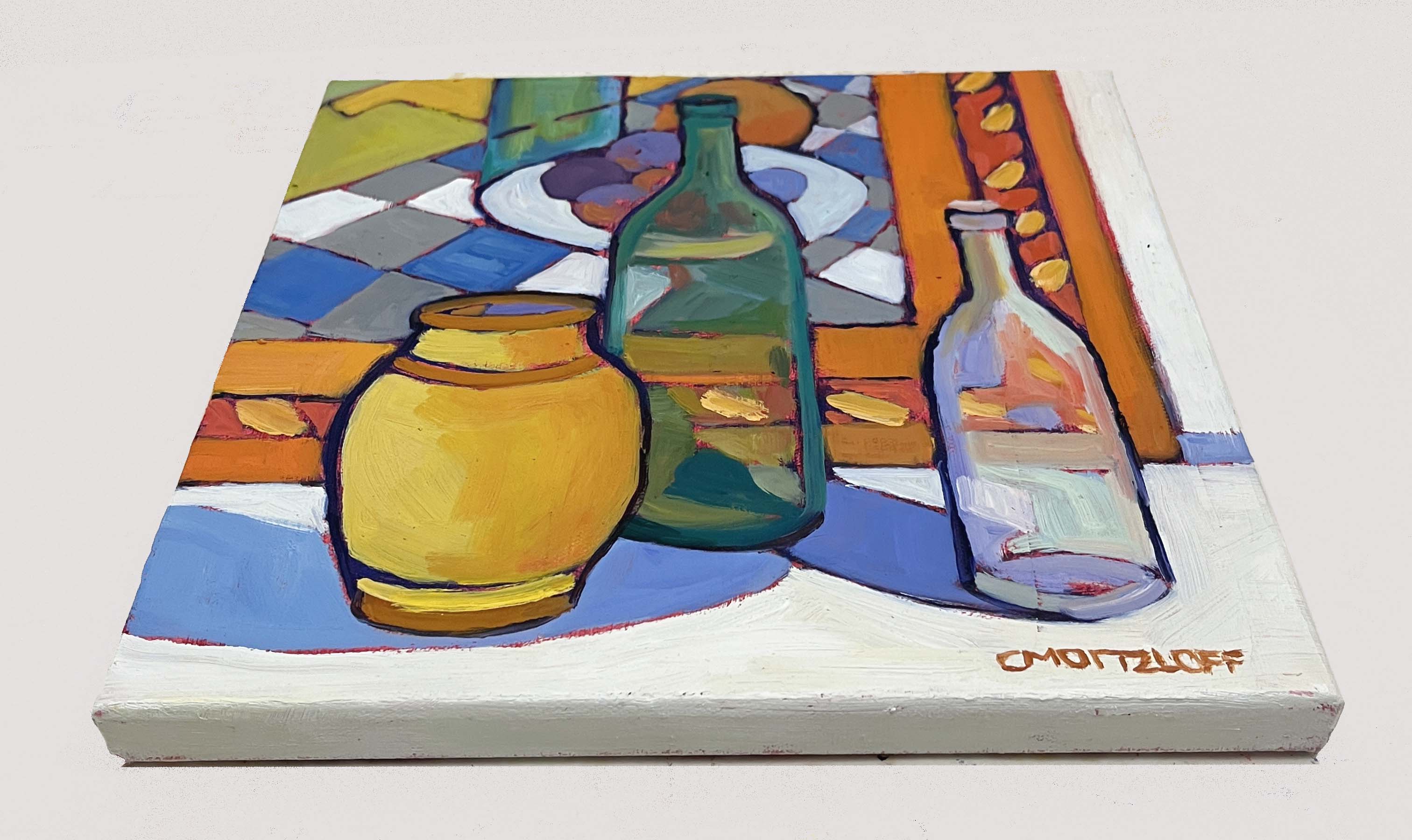 I’m fascinated by how ordinary objects can become timeless through color, line, and composition. Here, the solid weight of the jar contrasts with the shifting transparency of glass. The patterned geometry behind them offers a sense of memory and context, like a painting within a painting. The interplay of reflection and shadow forms its own language. It invites the viewer to linger. It encourages the viewer to consider how the everyday holds both presence and history.