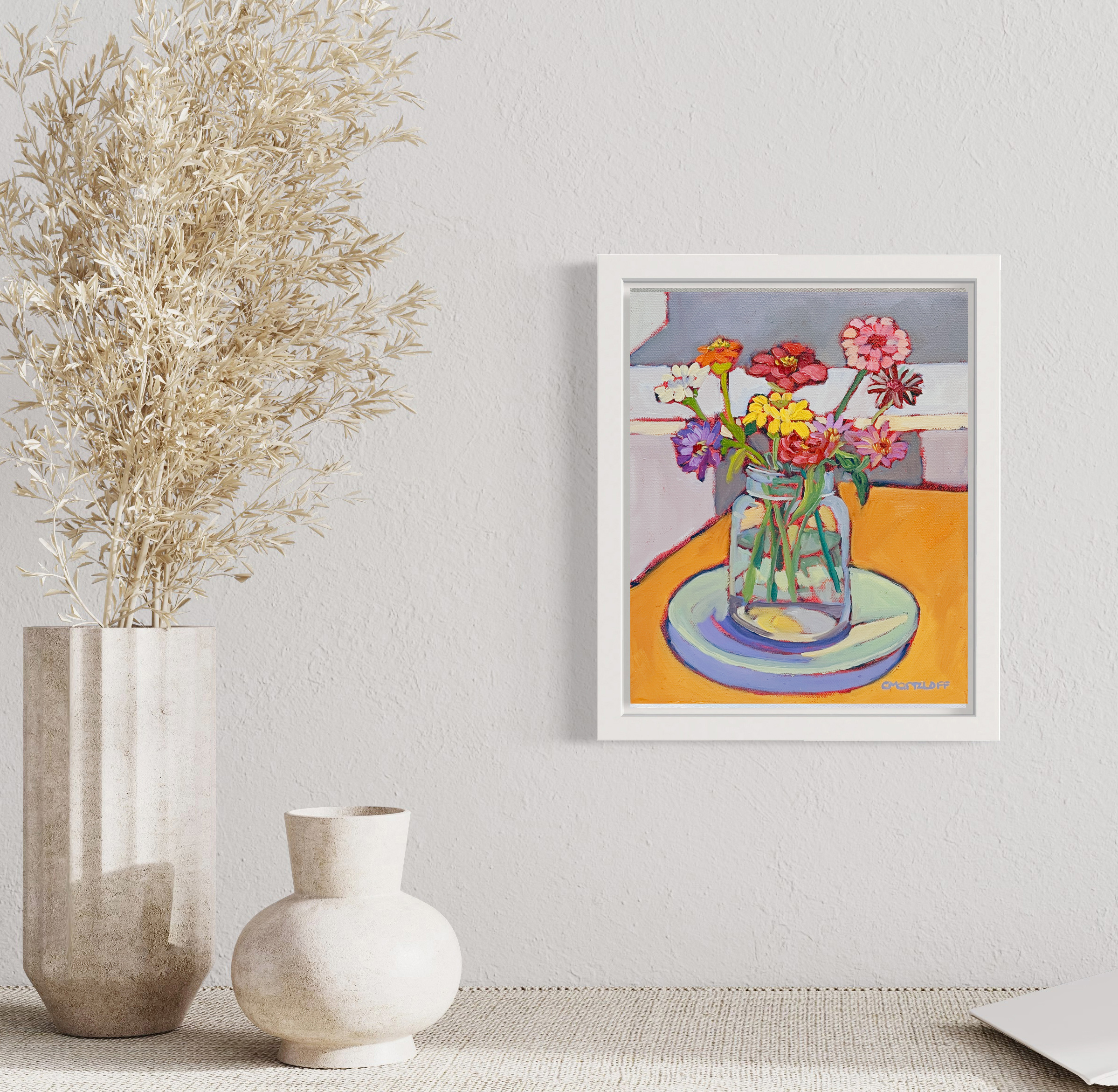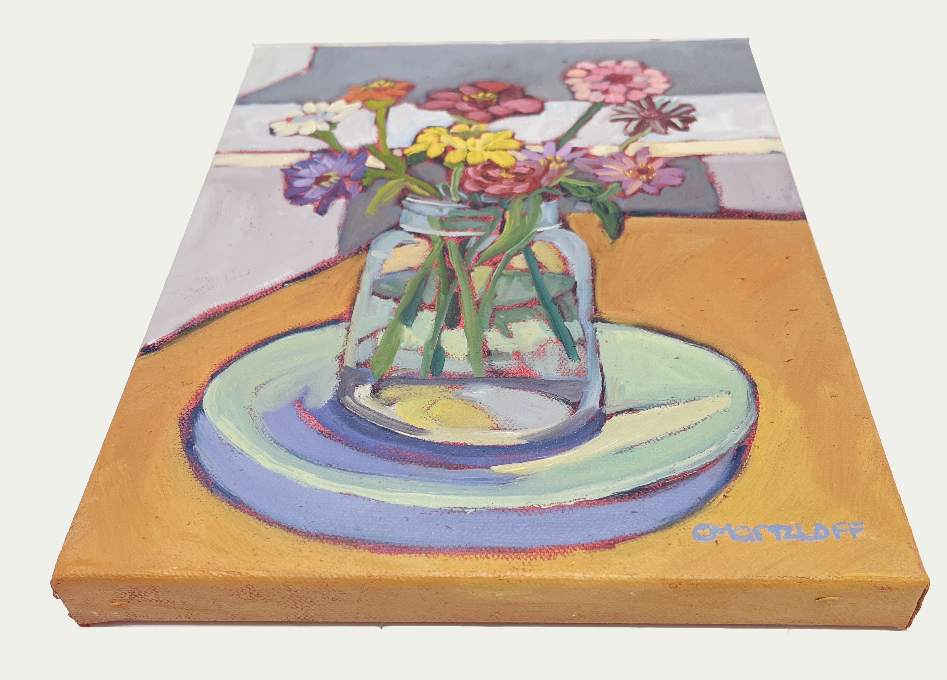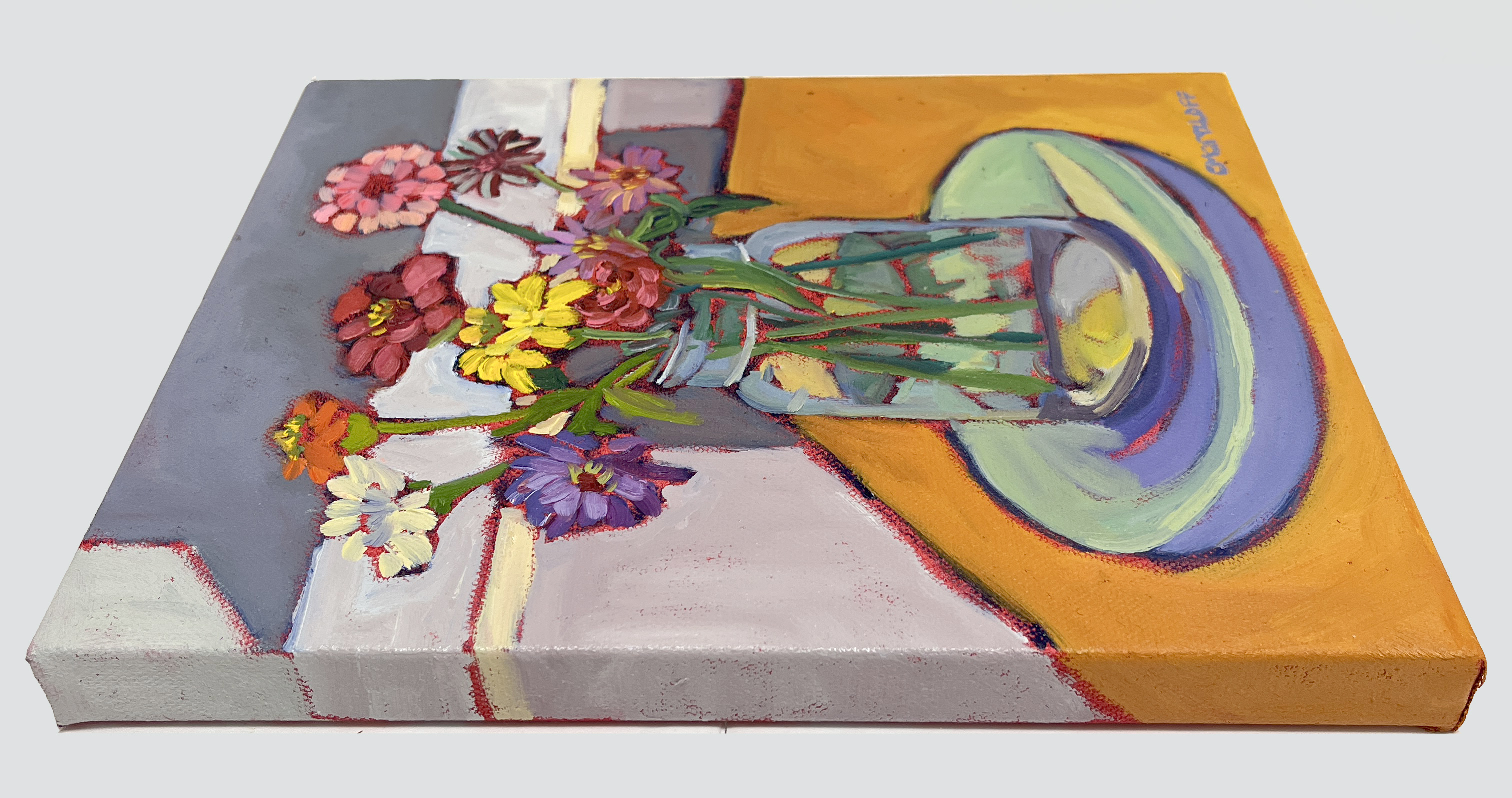 Simplifying the background has become part of my process in some paintings. In this one, I did not recreate the exact details of my kitchen—the oven, the table, the wood grain. Instead, I reduce them into essential shapes and colors. The warm orange tones of the table enhance the scene. The pared-down geometry behind the vase allows the flowers to hold the center. It’s less about literal representation and more about distilling the scene into something alive with color and rhythm. The zinnias, short-lived as they are, seem to ask for this kind of immediacy.