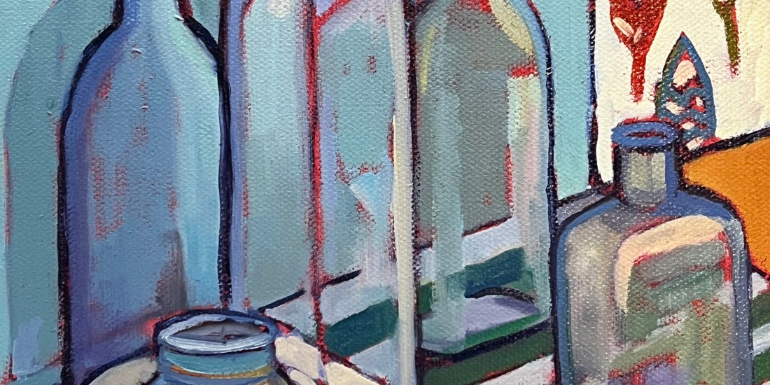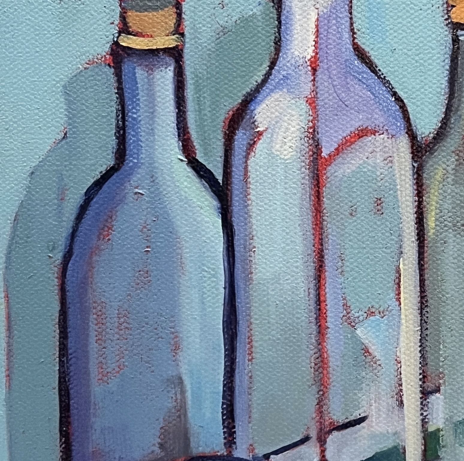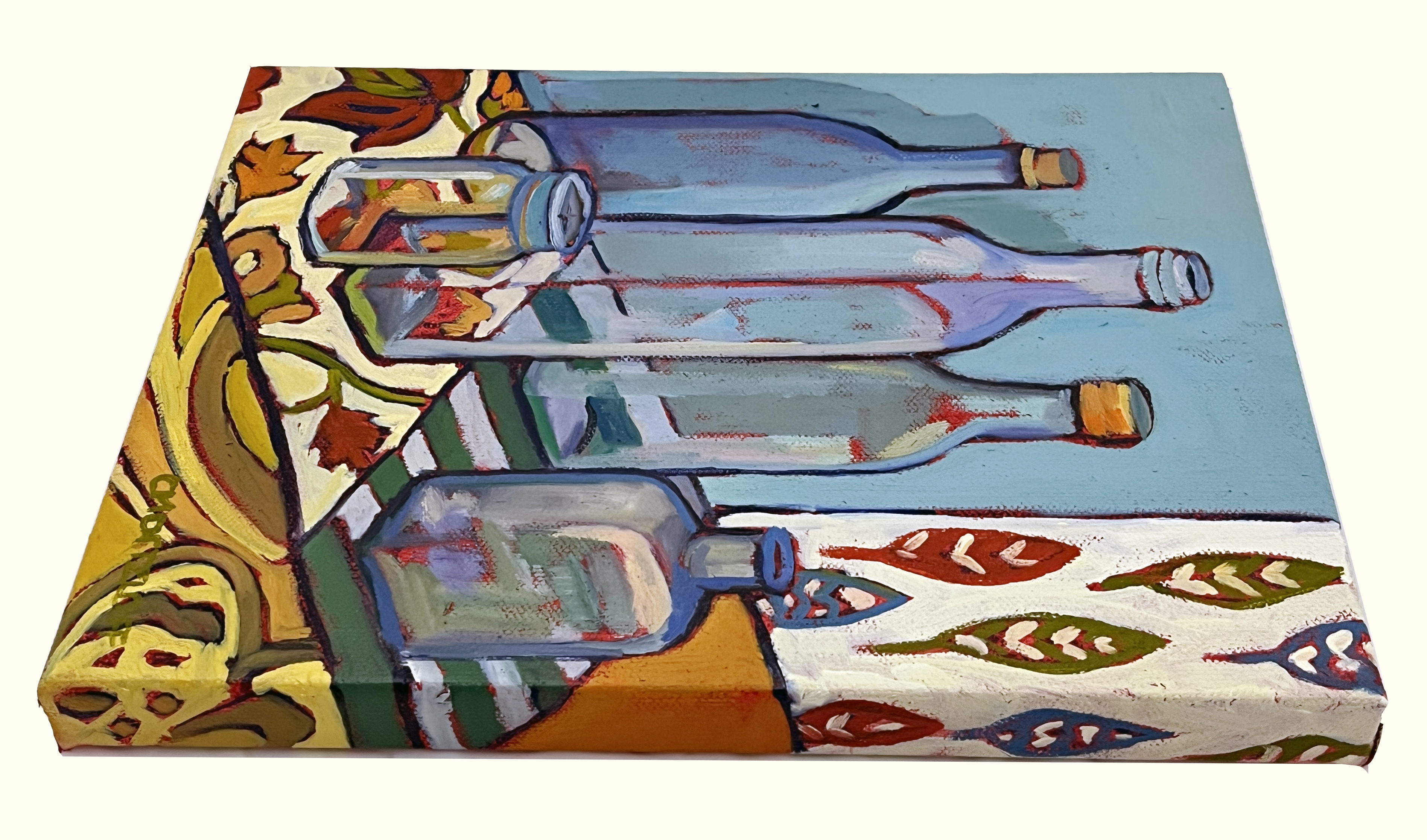 Light Between Seasons began with bottles—a subject I’ve explored several times this season, yet each painting offers its own surprises. I feel drawn to the mystery and sense of excitement in having glass objects as part of an arrangement. Glass is endlessly fascinating. It captures light differently every time. When paired with patterned fabric, the challenge and delight multiply. I feel like I stepped into something too challenging. Yet, I trust the painting process I have developed over the years.
