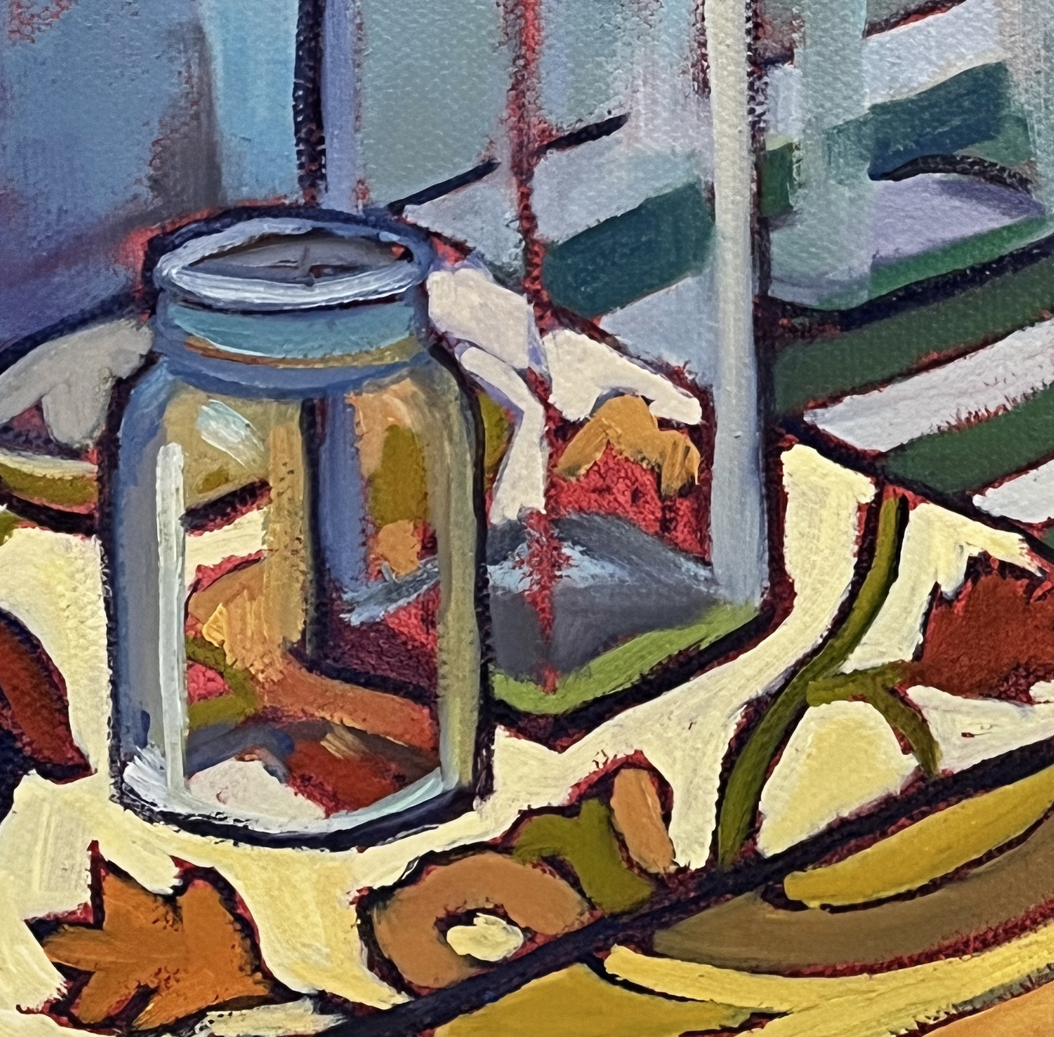 I love the balance of familiarity and discovery in repeating a subject. While I know these forms intimately, the light, reflections, and interplay with pattern keep the painting moving and alive. Up close, the brushstrokes are simple marks, swabs of color; step back, and they become shapes, textures, and light. This tension between suggestion and literal representation is at the heart of my work.