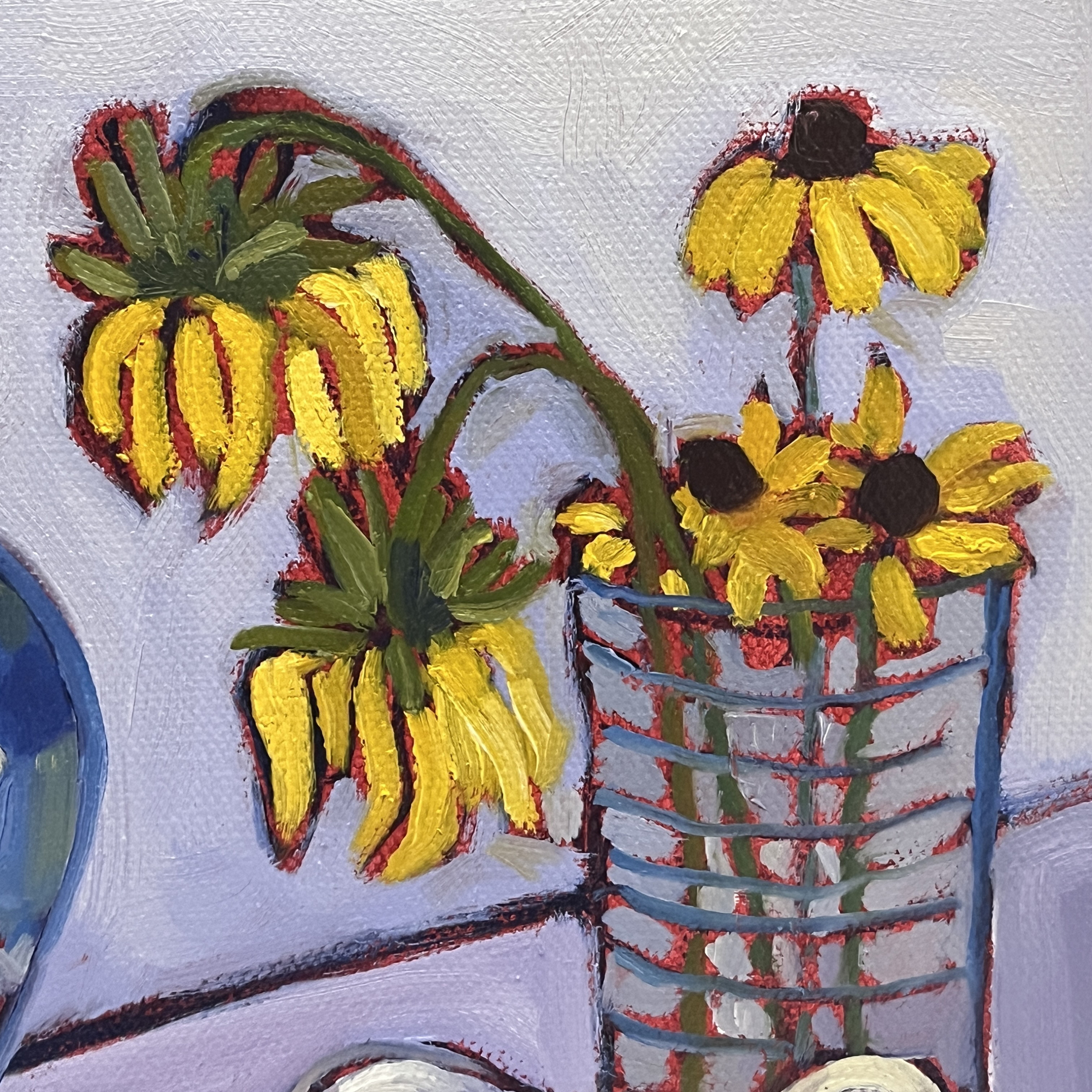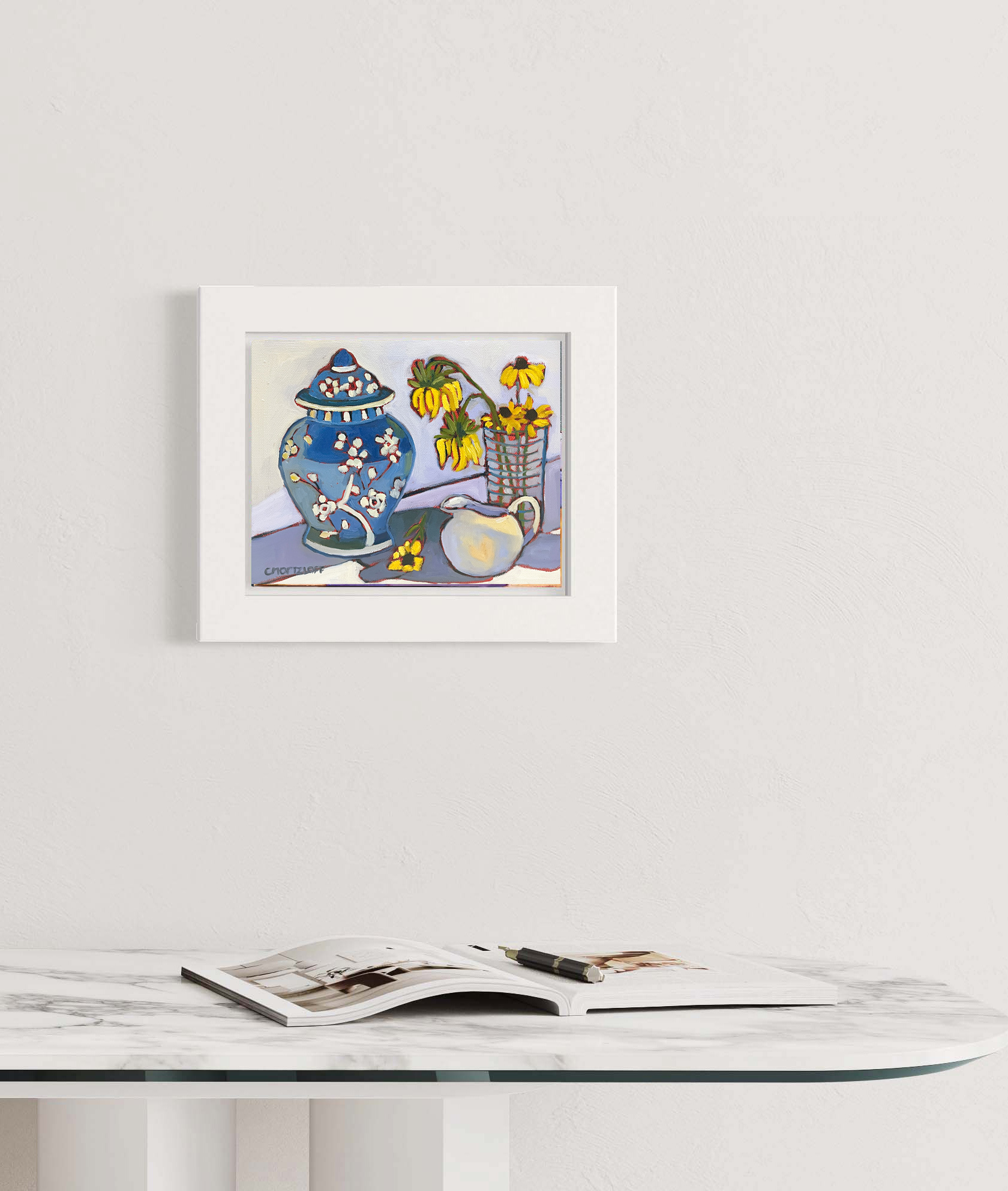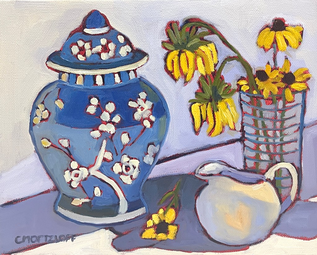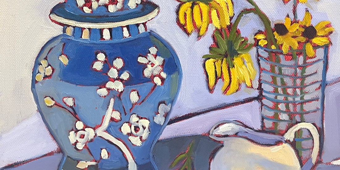 There’s a quiet rhythm in this still life — a balance between form and feeling. The golden coneflowers, their petals softening and curling, lean toward the blue ginger jar as if in conversation. Their gentle wilt drew me in. There’s something human in that gesture. It’s something about the way beauty changes as time passes.