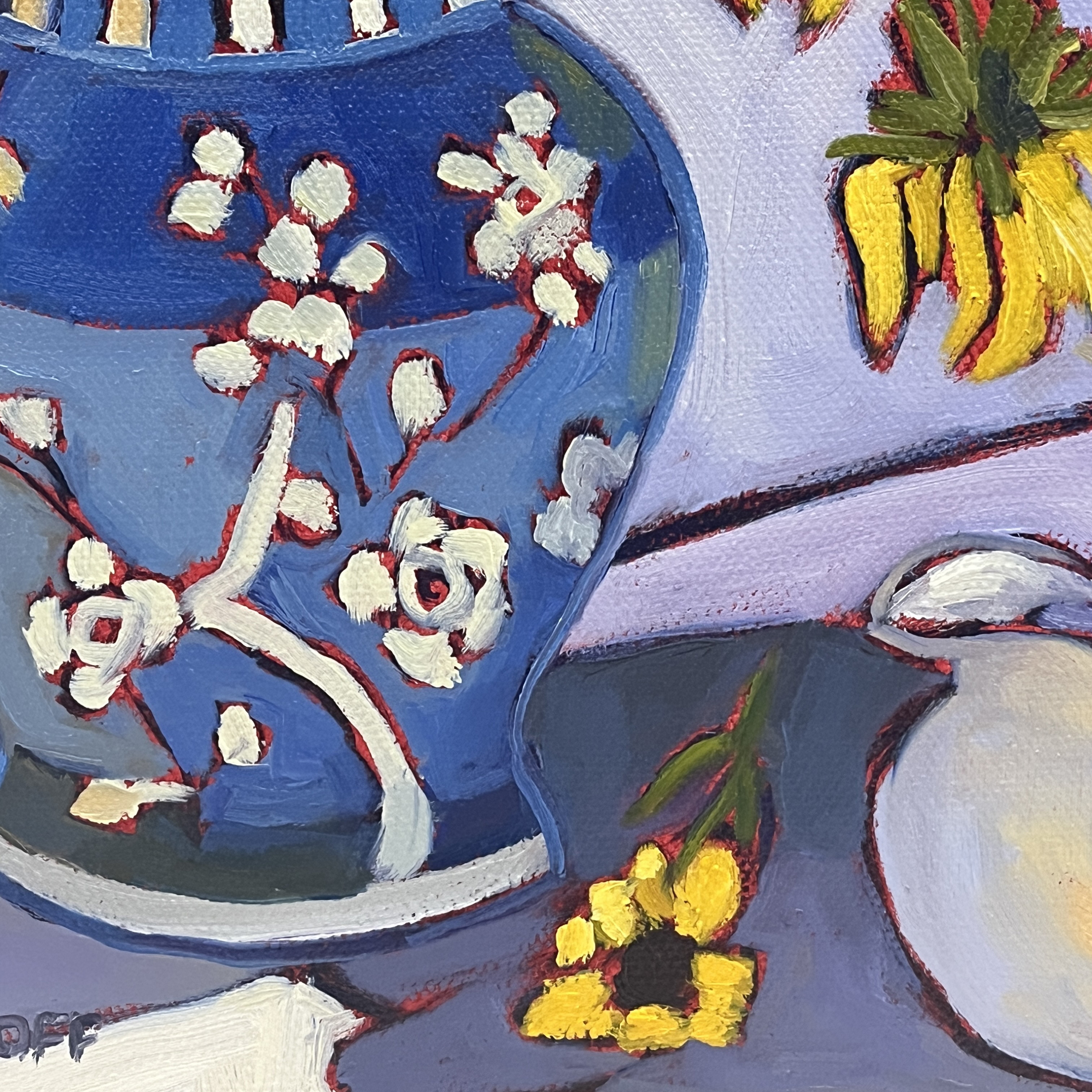 I’ve always loved the pairing of blue and yellow — the warmth and calm they create together. In this painting, that harmony feels both natural and intentional. It echoes the contrasts we carry within a single day. There are moments of ease beside moments of surrender. The jar and creamer remain steady, composed; the flowers bend and yield. Together, they form a quiet scene that holds space for everything. It includes the stillness. It includes the shift. It includes the acceptance that it all belongs.