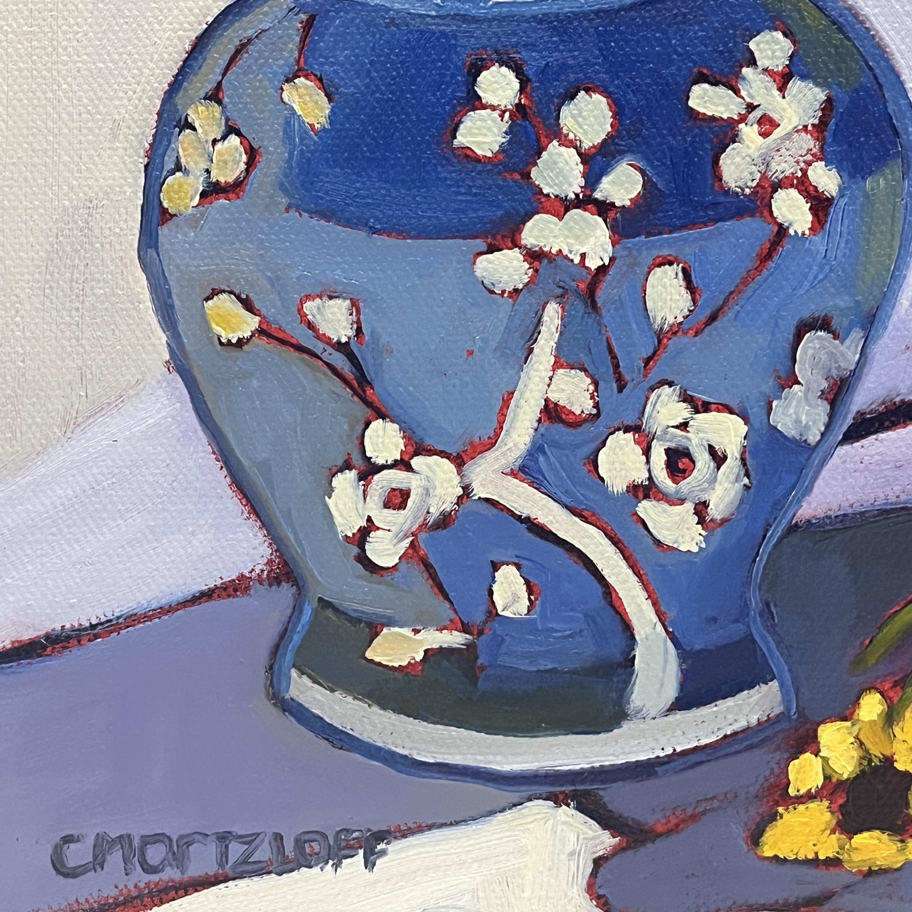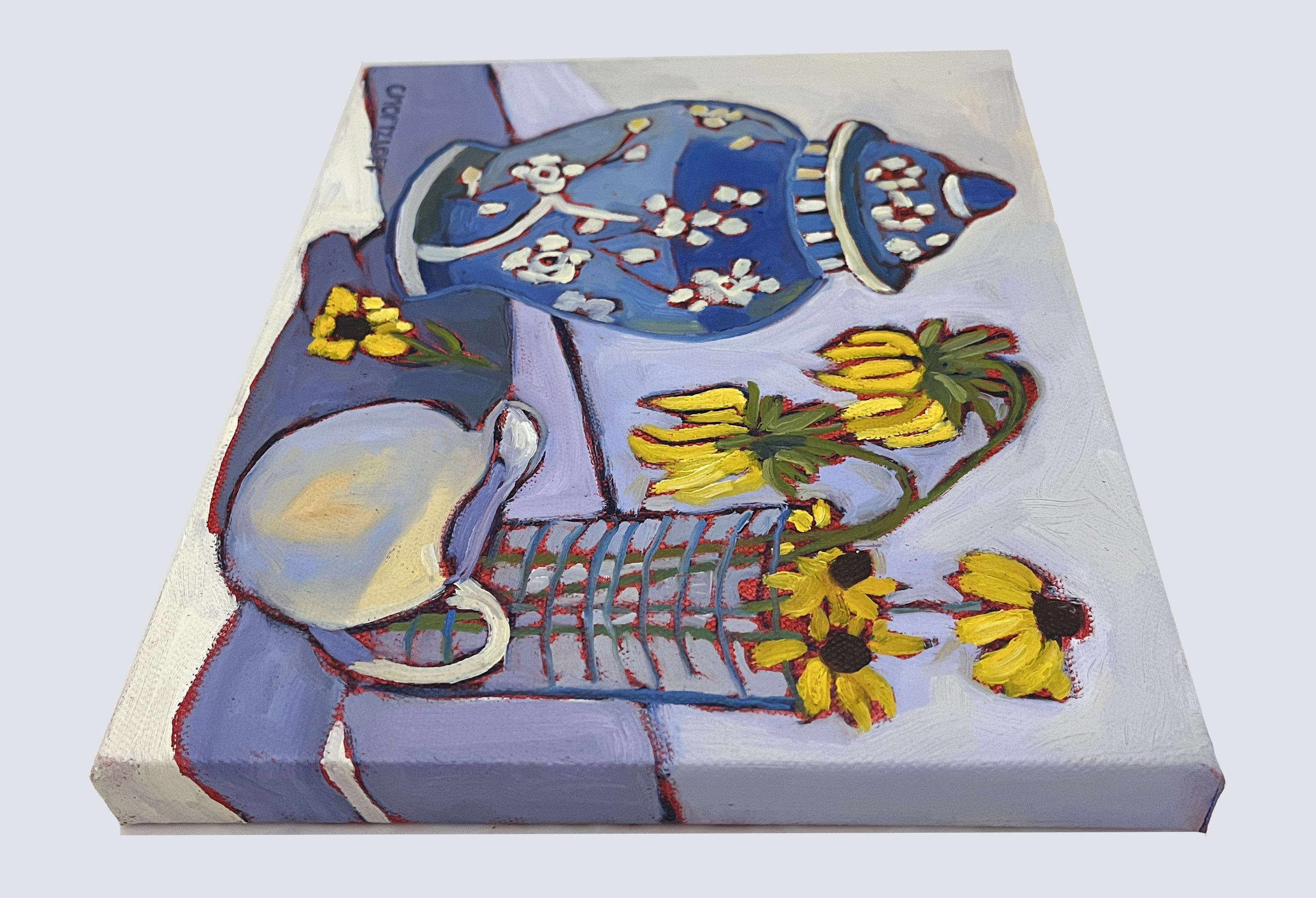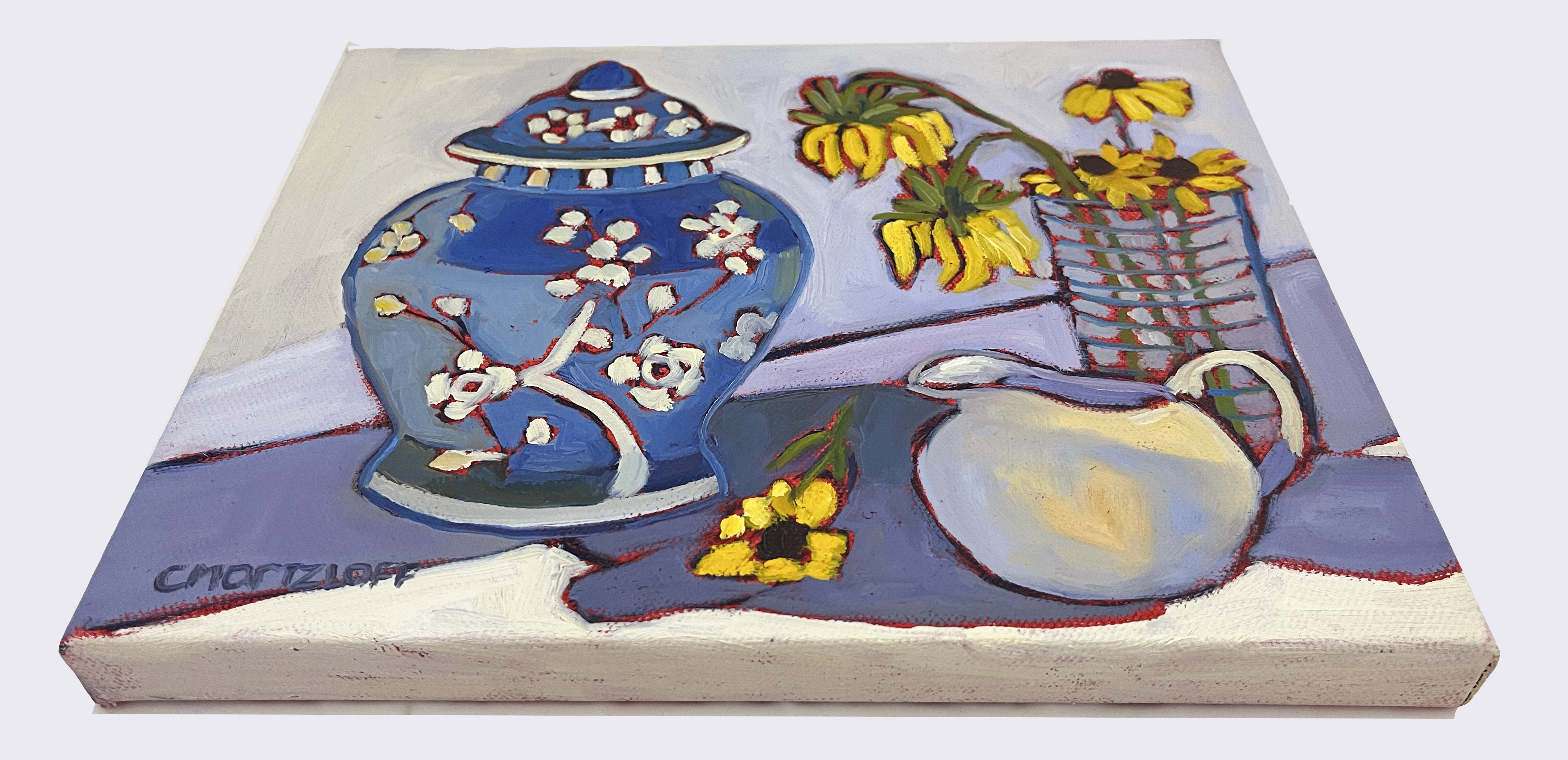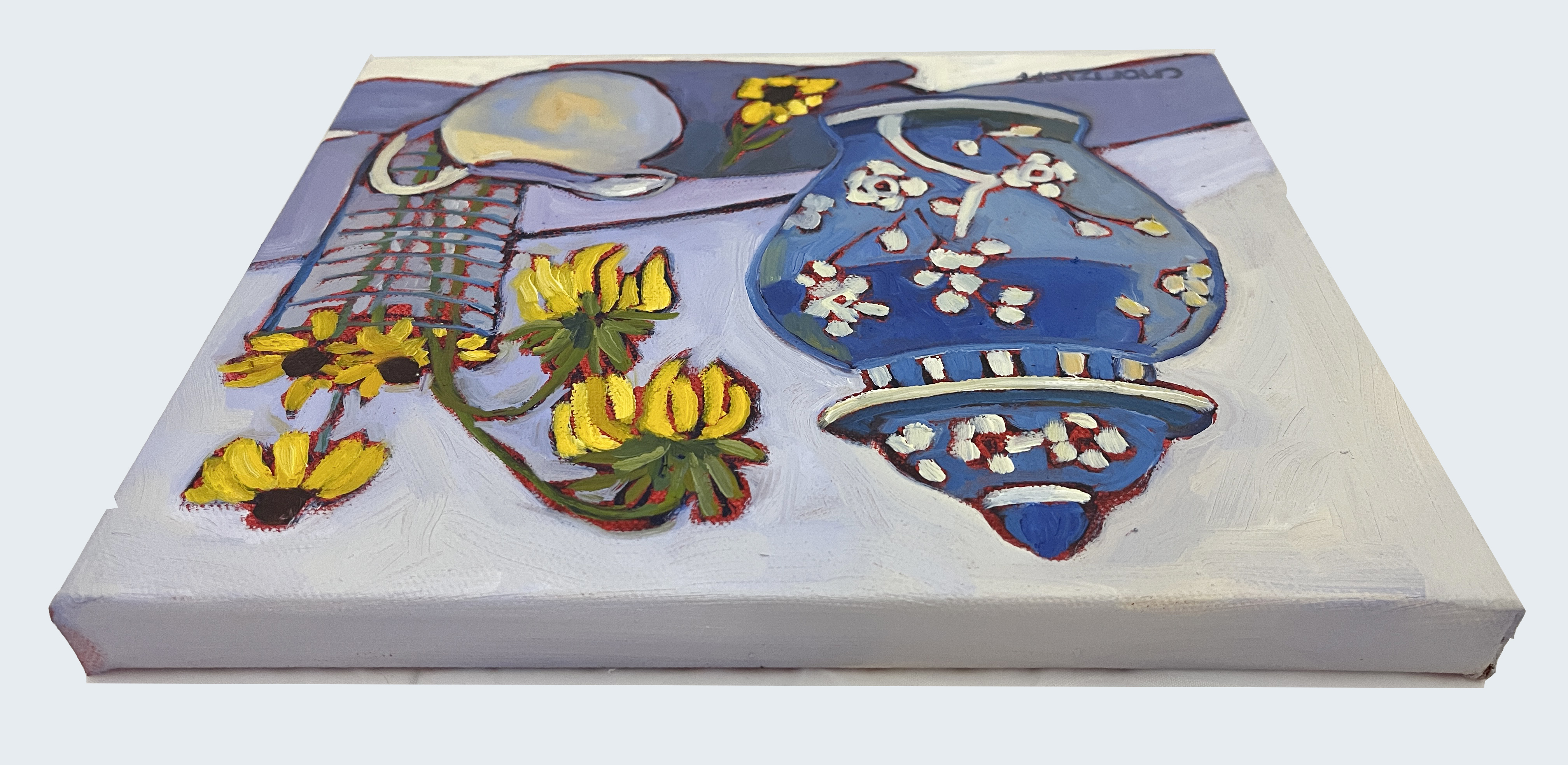 Blue Jar and Wilted Blooms – 8″ x 10″ Oil on canvas – $300
