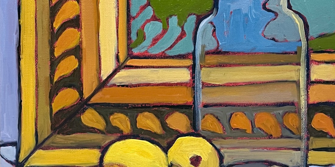 On the Shelf extends an ongoing exploration of still life. This exploration is shaped by pattern, structure, and the use of framing within the composition. In this painting, the arrangement rests on a table, while the suggestion of a frame introduces a subtle architectural element. This framing feels like an unexpected form of decoration to me. It provides context and quietly holds the objects in place. Color and pattern become active parts of the composition. As I paint, I experience the objects as containers for color, allowing it to speak life into the arrangement.