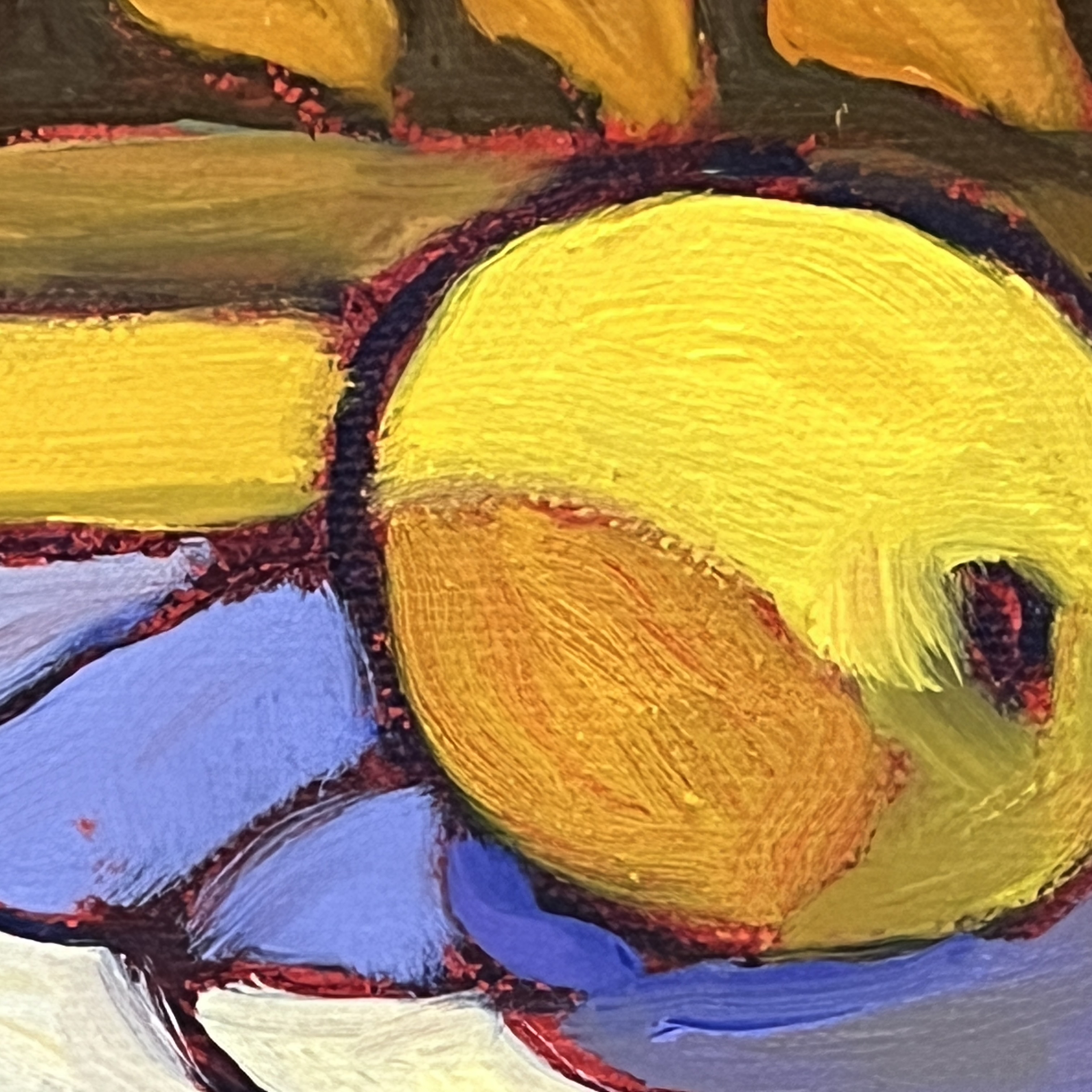 The painting carries a quiet brightness—contained but not restrained. Familiar forms feel slightly unexpected within these boundaries, and the colors lift the mood without tipping into excess. There is a steadiness here, paired with warmth: a moment where things feel gathered, balanced, and gently alive.