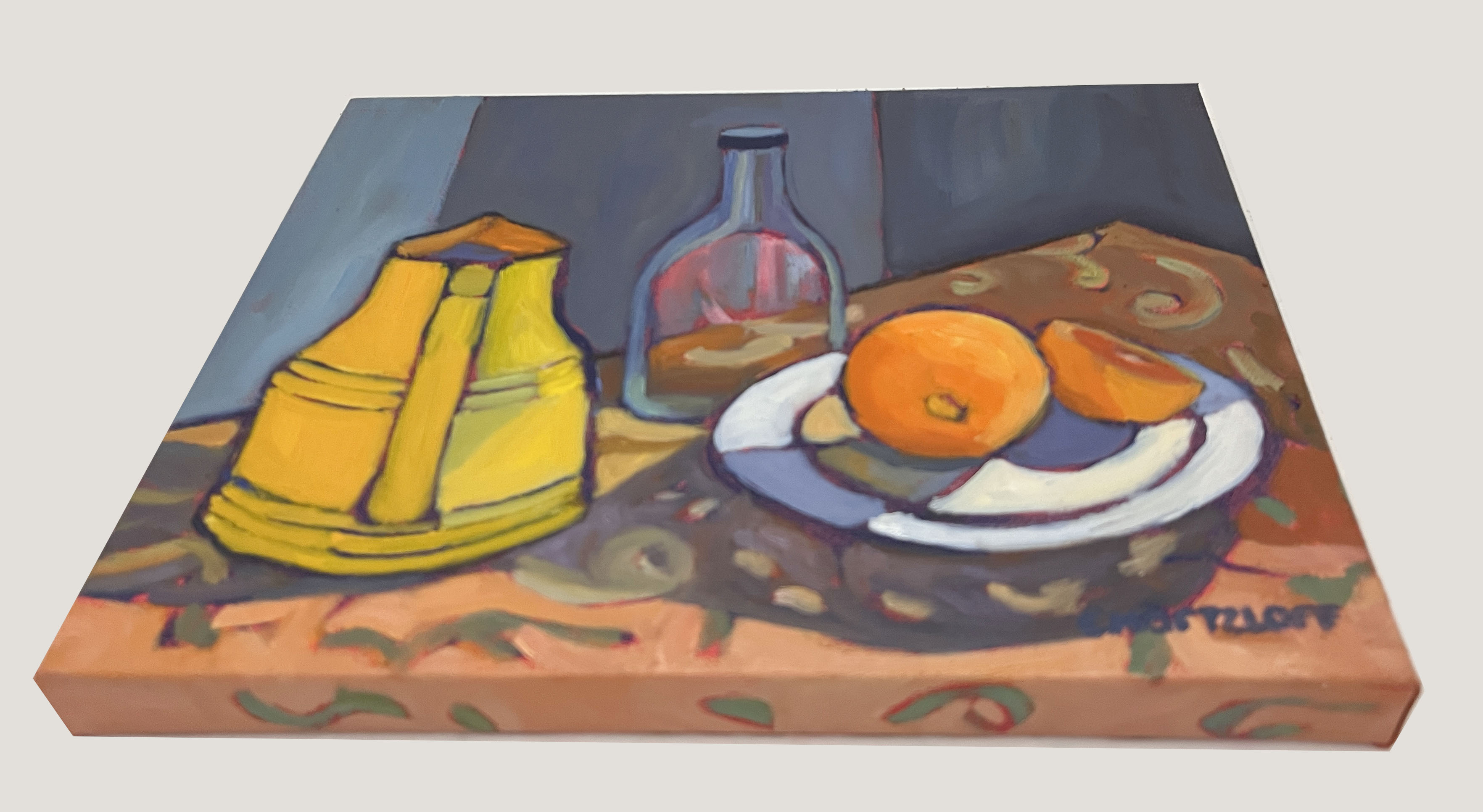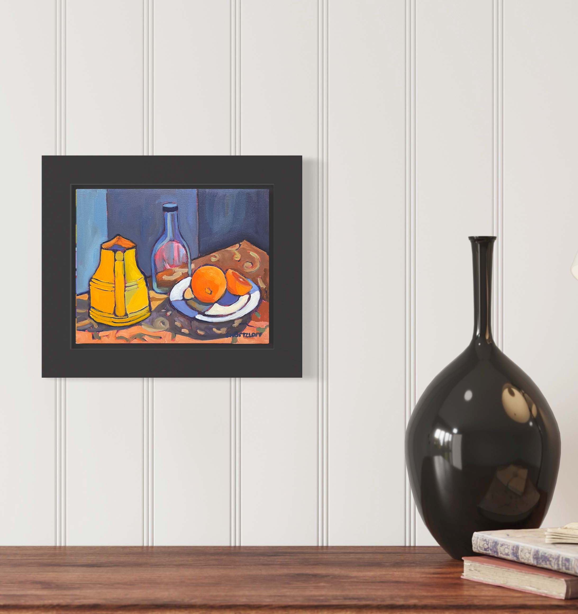 The yellows and oranges started to feel like small sources of warmth against the cool, shadowed space. Everyday objects—a bottle, a carafe, a piece of fruit—became part of a quieter mood. It’s like a scene you might notice if you woke early and wandered into the kitchen before the day begins.