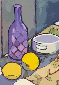 This still life continues my exploration of working against a dark ground. I notice how that choice shifts my experience of the setup. It also affects the relationships between colors. Against the darker field, the palette becomes more vivid—yellows feel almost lit from within, purples deepen, edges begin to glow. The objects themselves are familiar to me, returning again and again in different arrangements, but the mood here feels altered. The darkness doesn’t flatten the scene. Instead, it seems to hold the forms. This allows the colors to emerge with a quiet intensity. As I paint, I focus less on describing the objects. I am more attuned to how they assert themselves within this atmosphere.