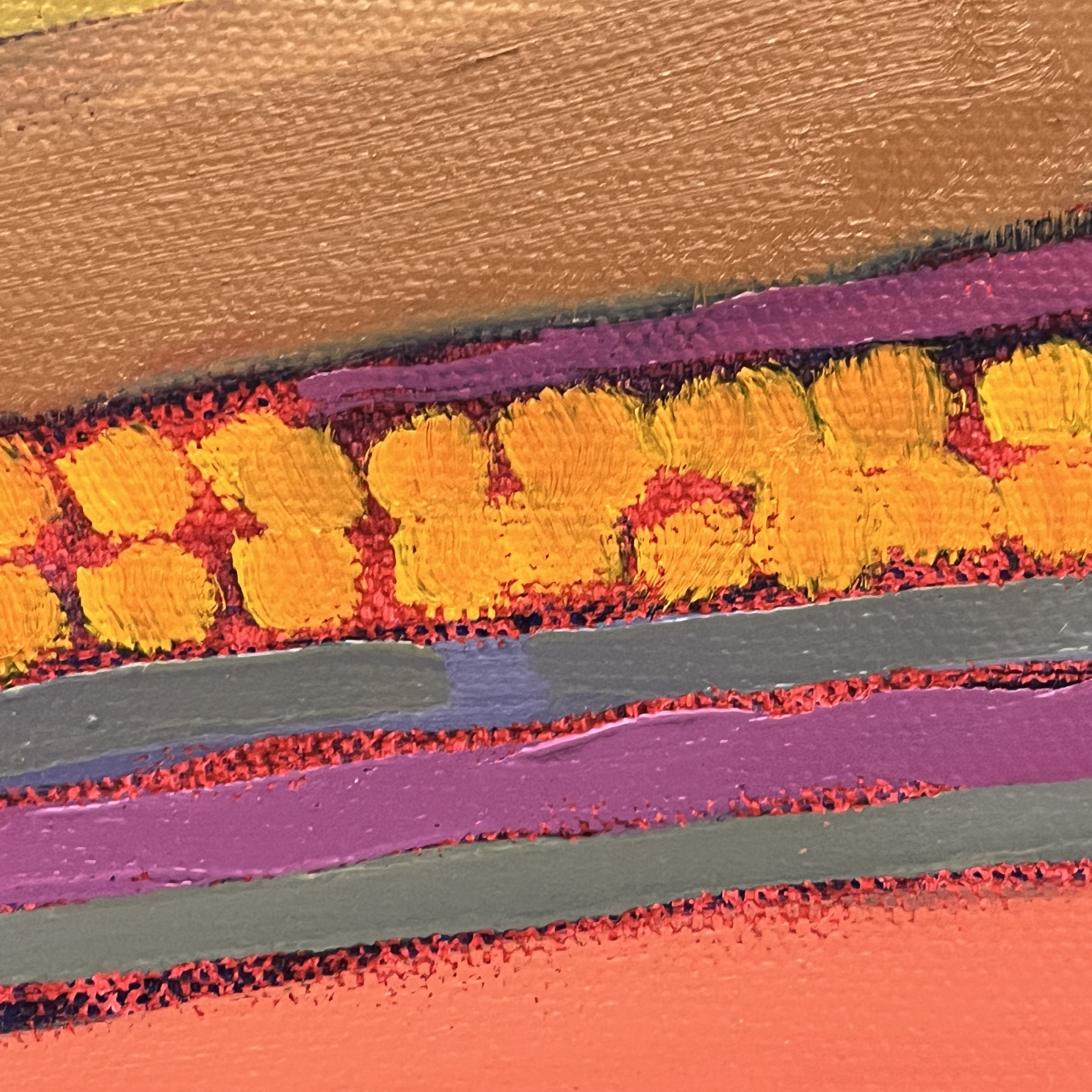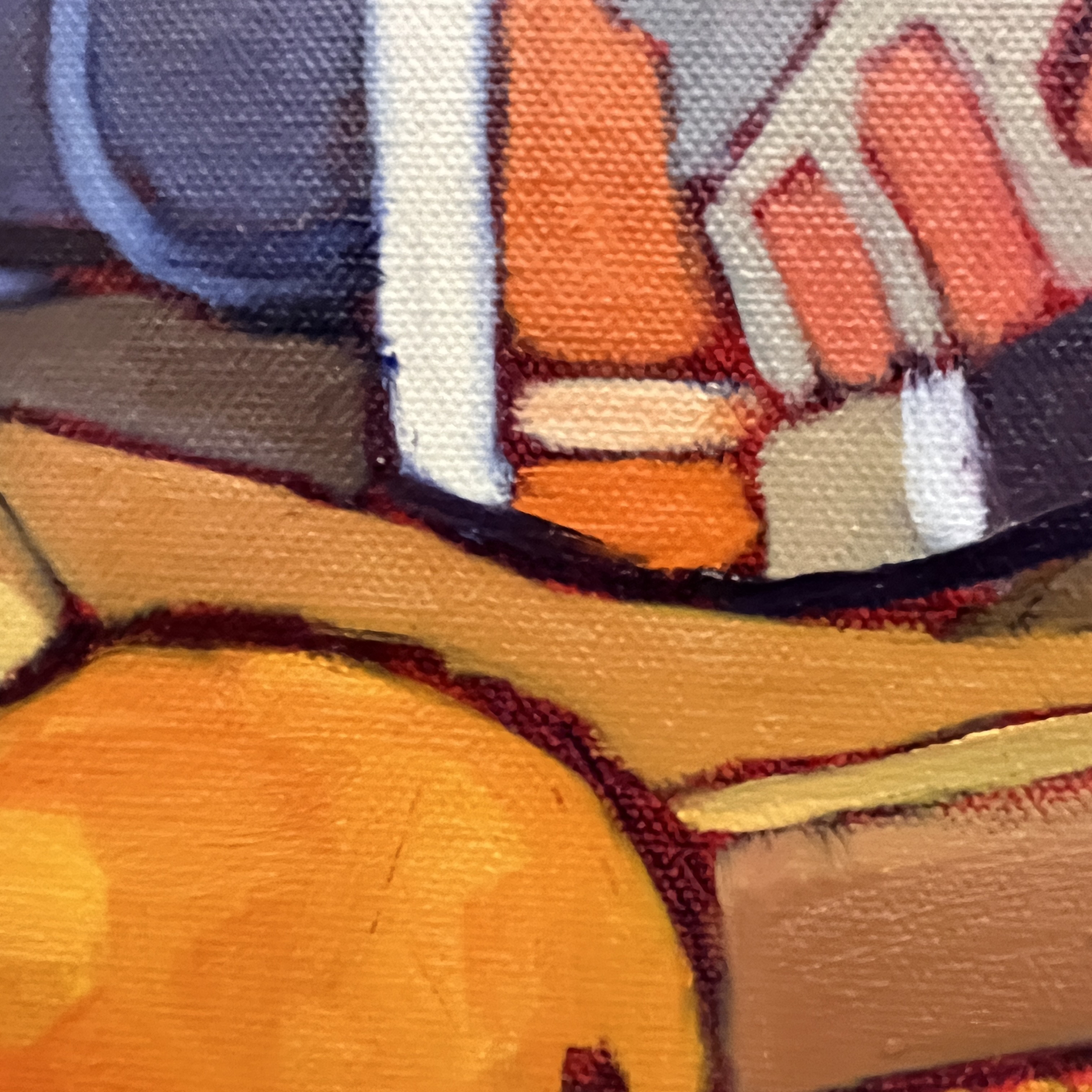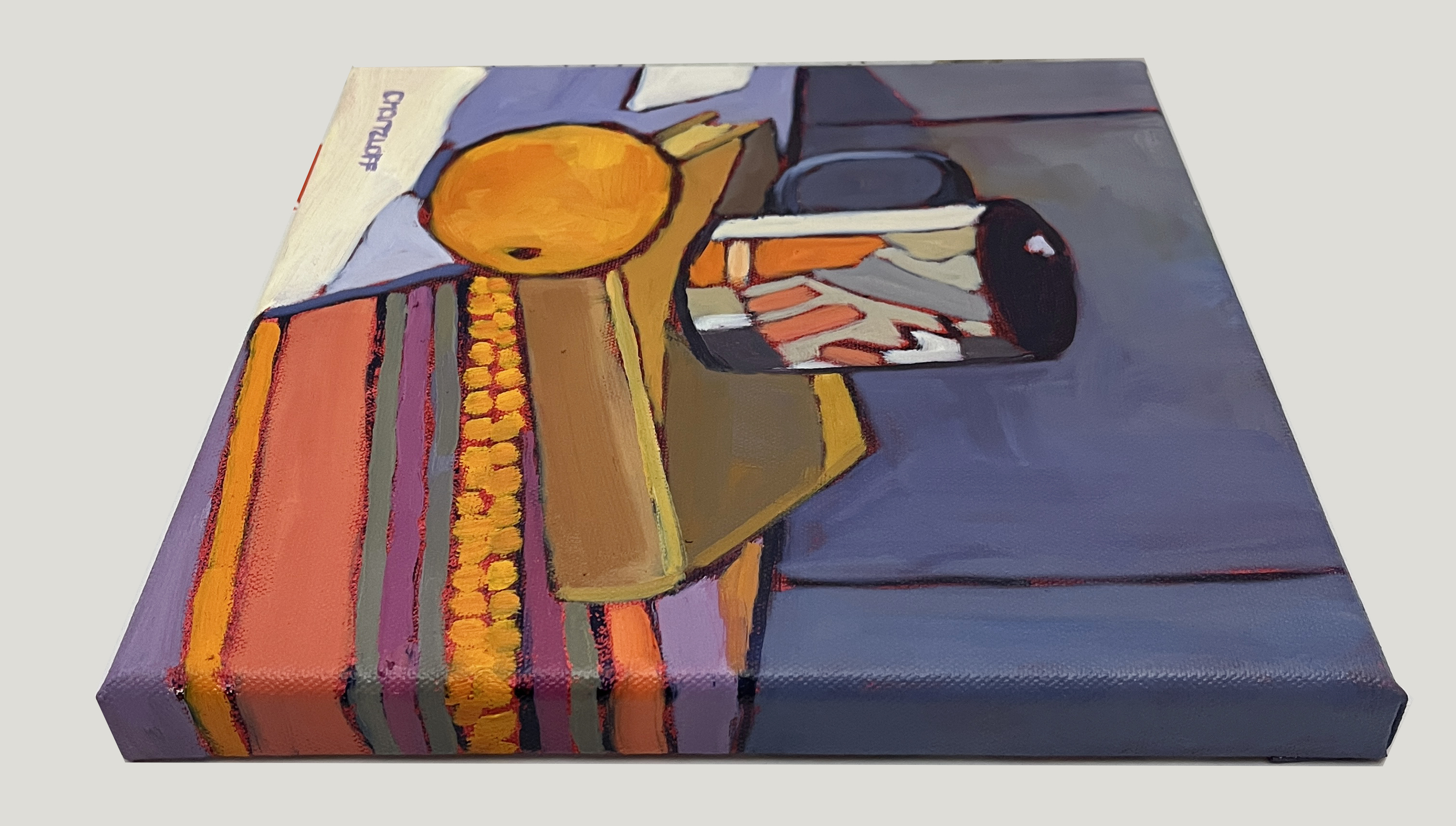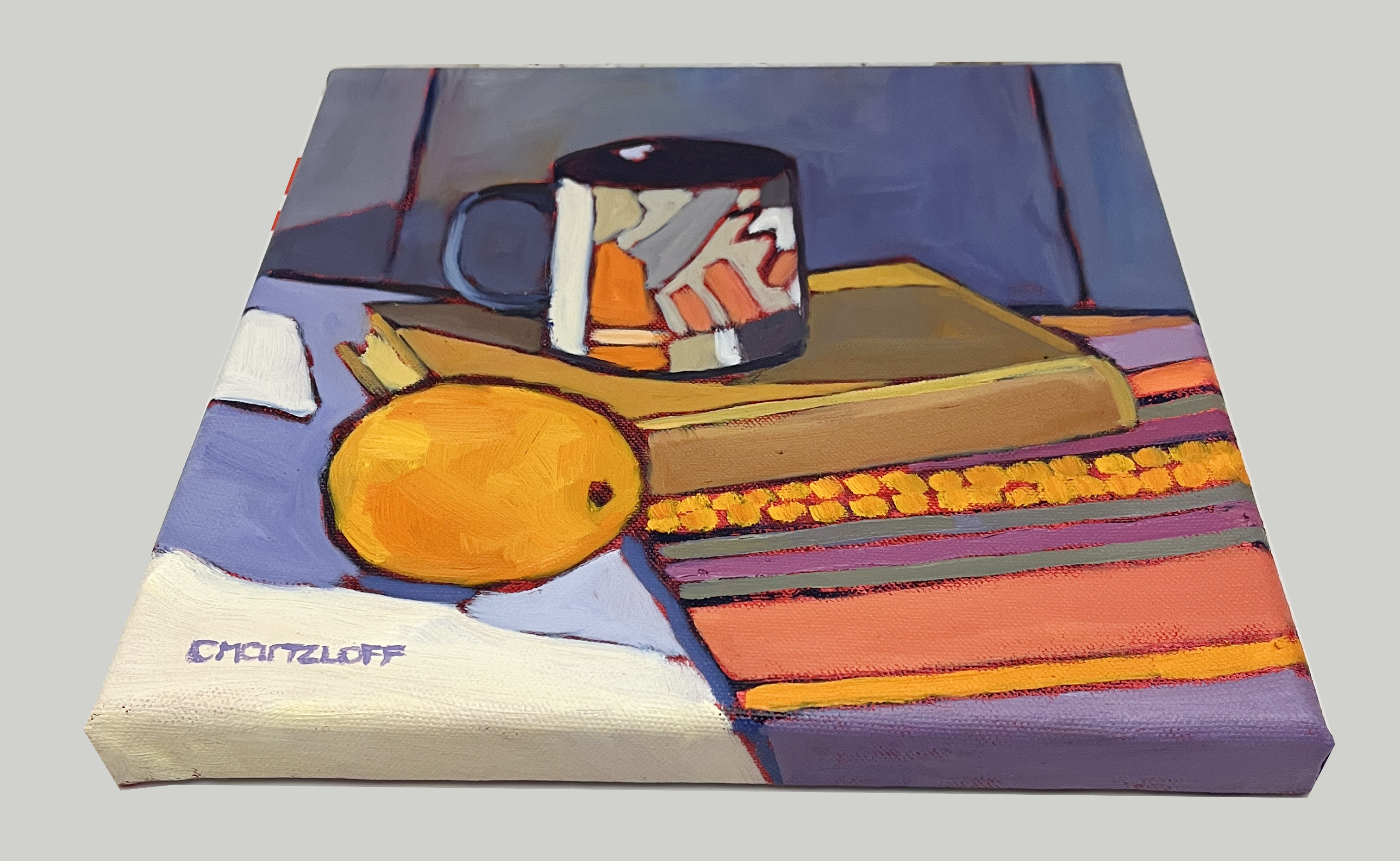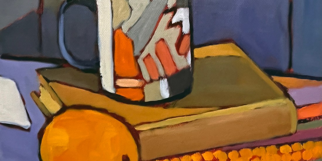 The mug carries particular meaning for me. It was a gift from my daughter and features one of her artworks, its geometric shapes introducing structure and rhythm into the composition. There is something deeply satisfying about painting her design — about translating her visual language through my own hand. Beneath the book rests a vibrant cloth I found during our town-wide yard sale. Its saturated colors and worn familiarity bring another layer of lived experience into the scene. What may appear at first as a simple arrangement is, for me, a gathering of moments — family, place, friendship, and creative exchange. Even the dark background began as a suggestion from a fellow painter, a small challenge that opened a new direction in my work.