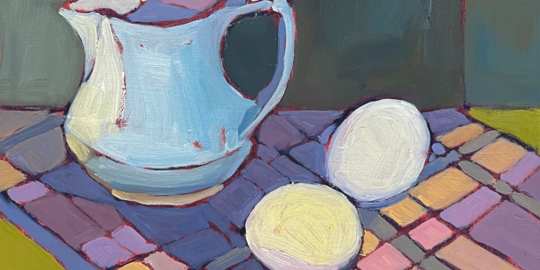 Violet Table with Pitcher continues my recent exploration of using a dark background within still life. I originally wasn’t sure I would enjoy working this way, but it has become an unexpectedly engaging process. The darker field gathers the light more closely around the objects, allowing it to settle with a quiet focus rather than spreading across the whole surface.
