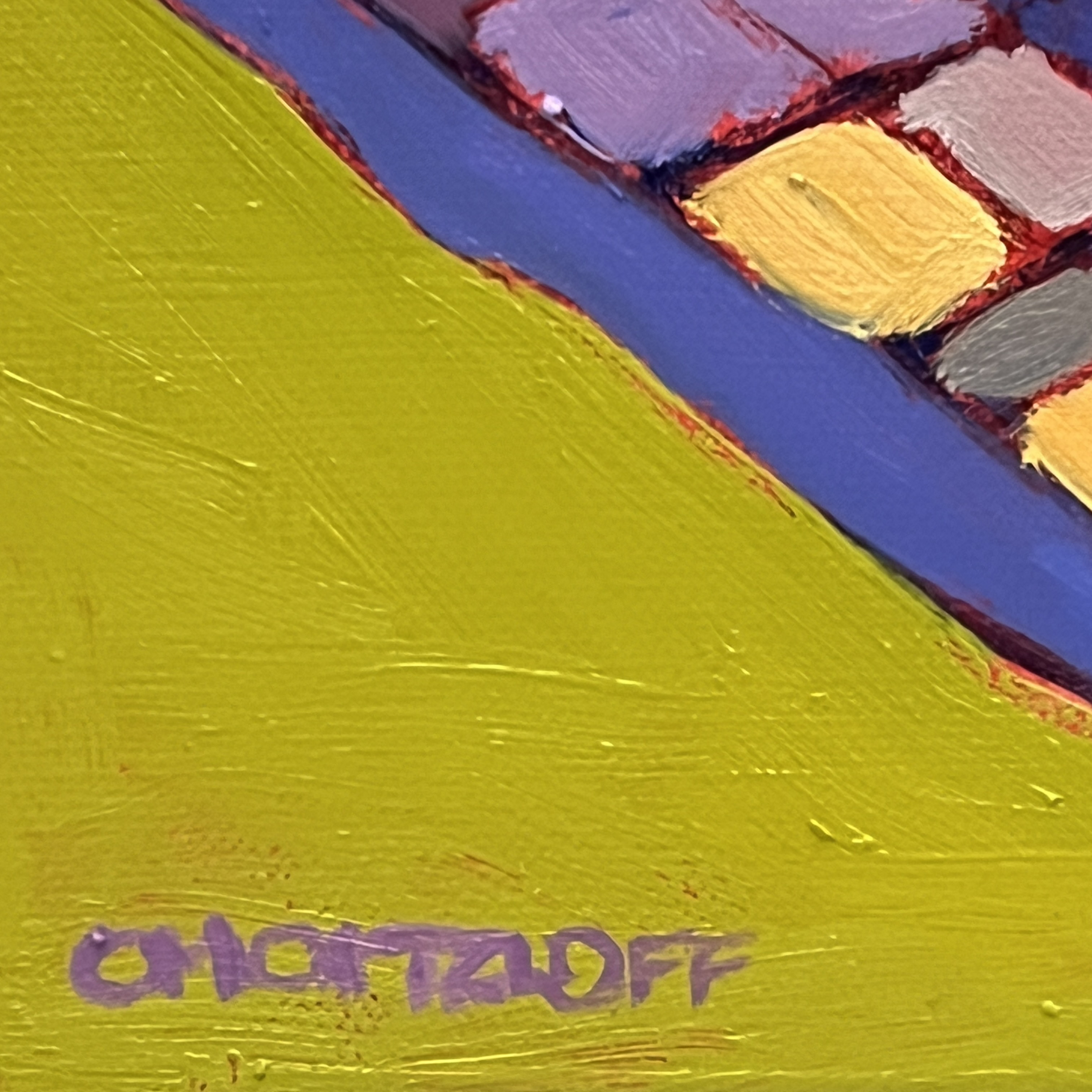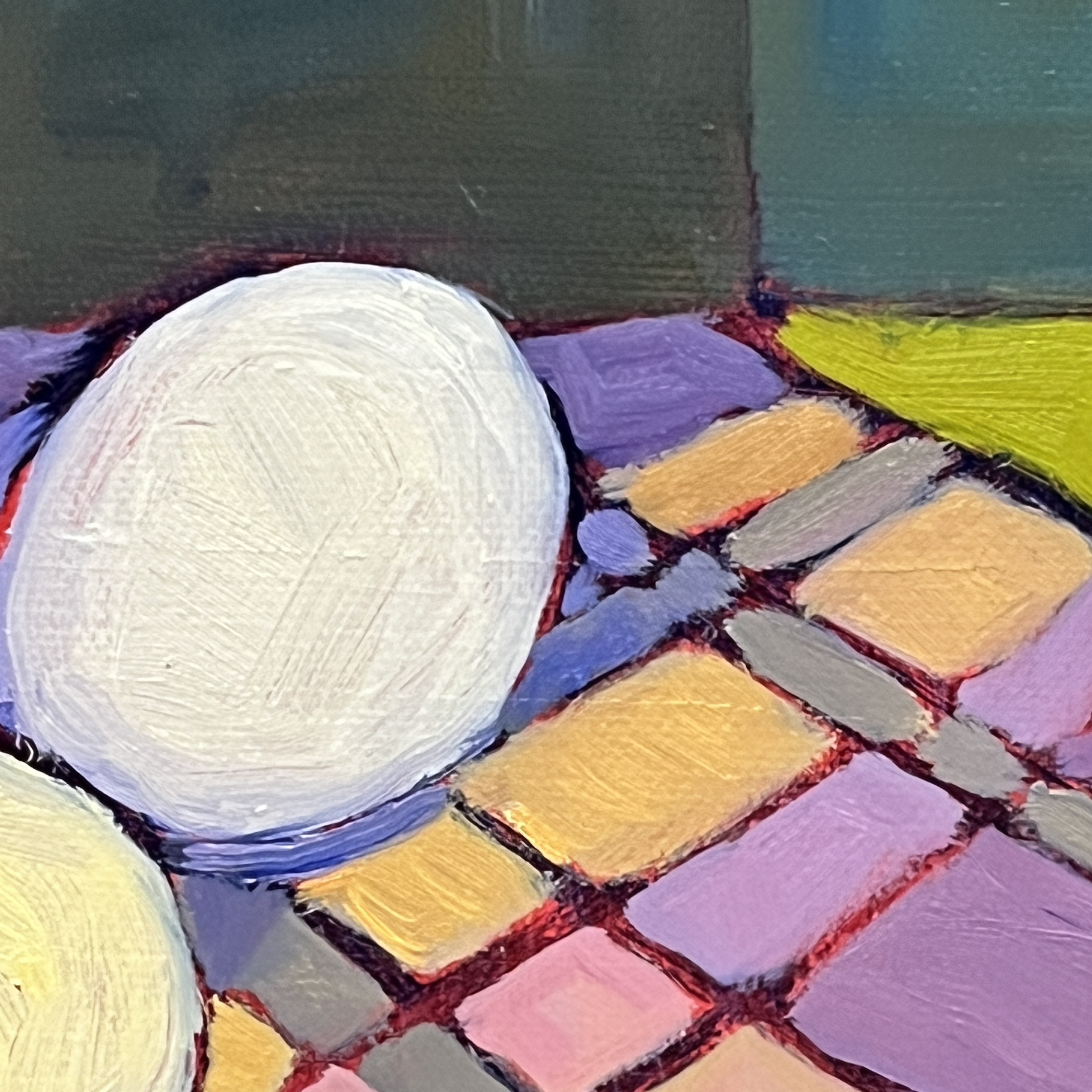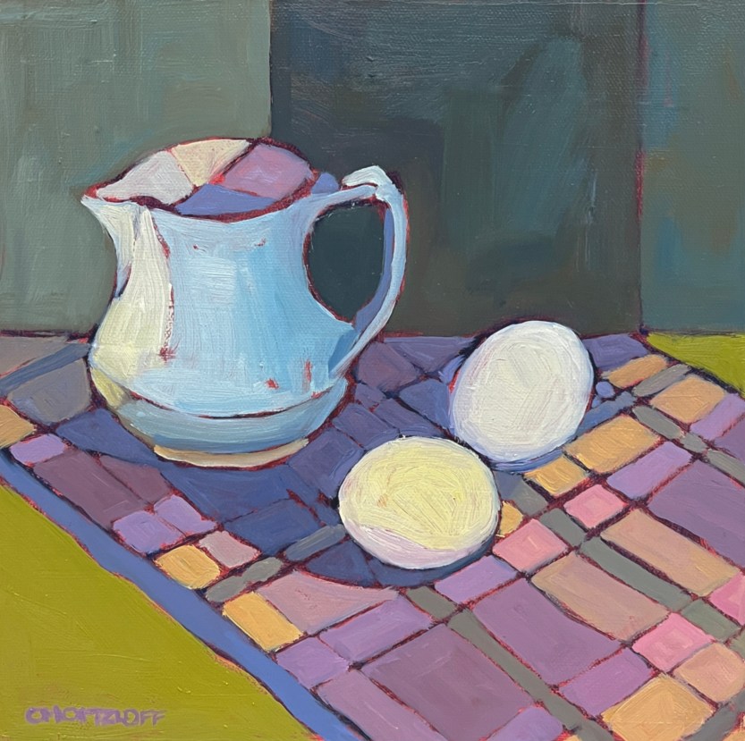 The composition grew from a few familiar studio finds. The small pitcher—really a creamer—came from a local antique shop where I get to travel back in time for a moment or two as I browse for treasures. And a vintage wool scarf from the same shop, provided the plaid structure beneath it. Like a warm familiar blanket, I was drawn to the rhythm of the woven patterns and how they could hold the forms together. A note of chartreuse along the edge introduces a contemporary spark, a color that continually surprises me in the way it brings other hues into balance within the square format.